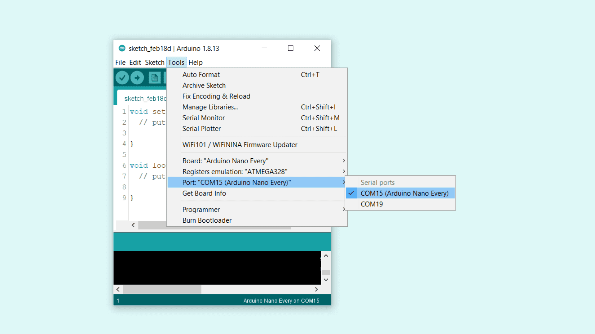 Now, let's make sure that our board is found by our computer, by selecting the port. Regardless what kind of program we are uploading to the board, we always need to choose the port for the board we are using. This is simply done by navigating to Tools > Port, where you select your board from the list.