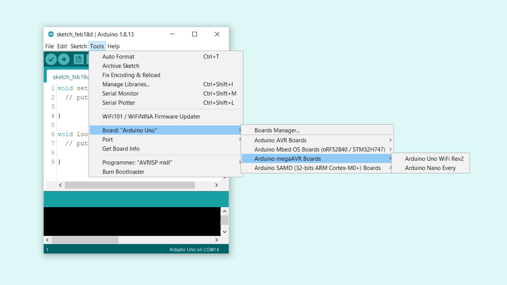Exit the board manager, and go to Tools > Board > Arduino > Arduino megaAVR Boards. Here you can see all the Mbed boards listed, where you can select the board you are using. You have now successfully installed the core.