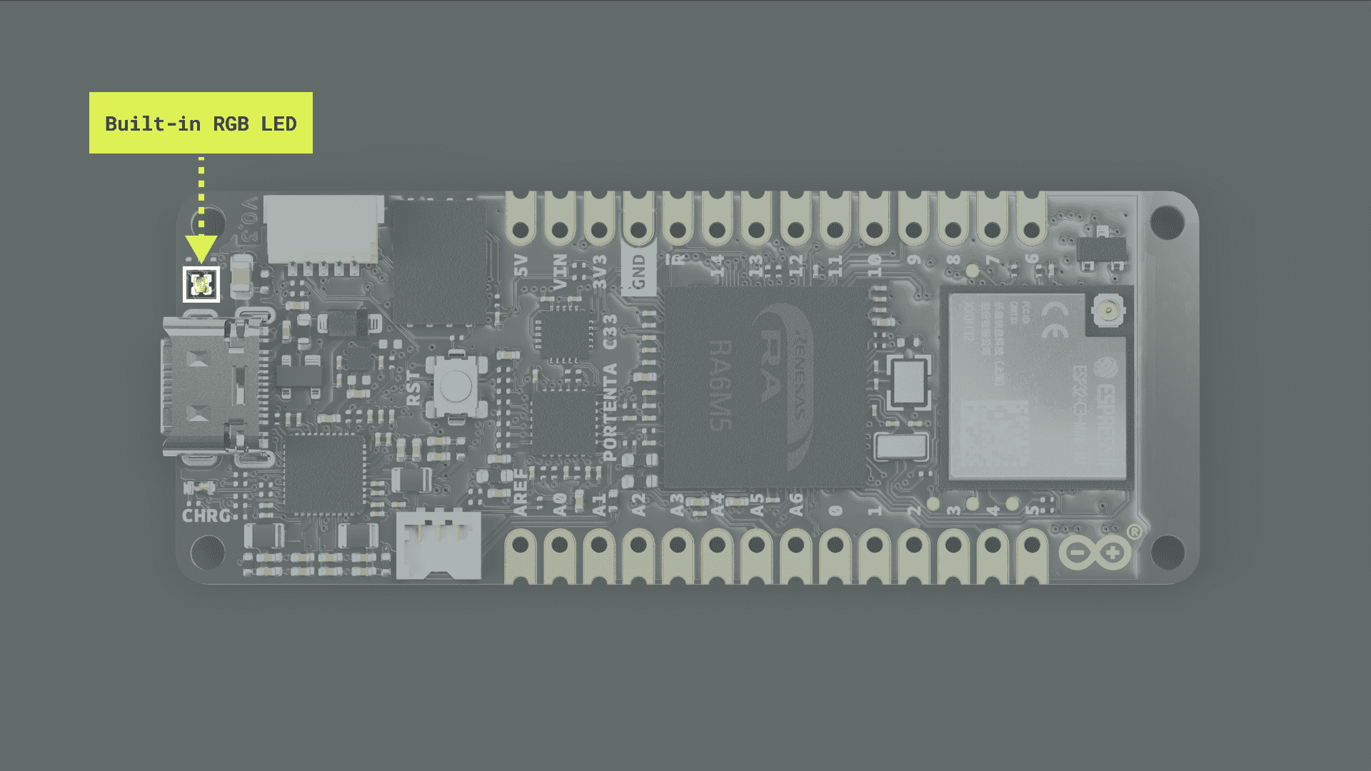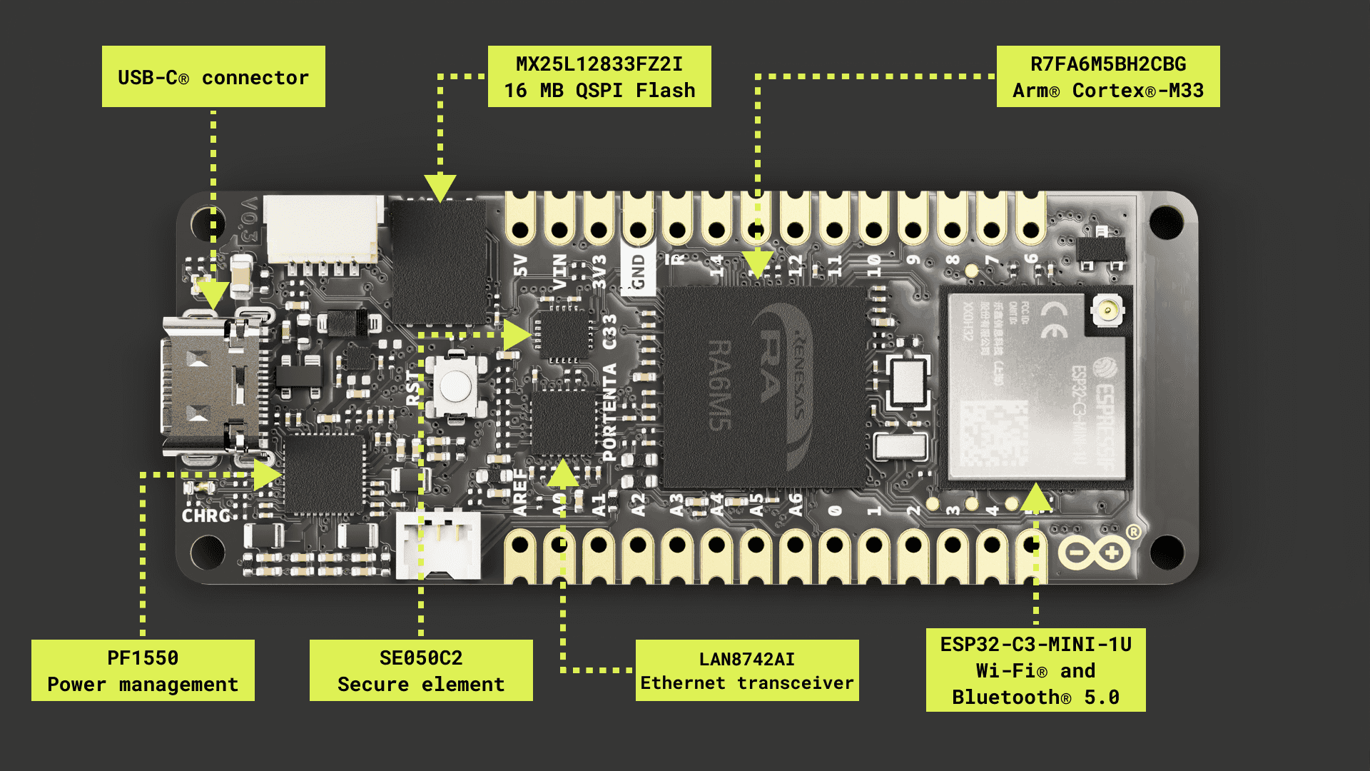 The Portenta C33 features a robust and efficient architecture that enables it for low-cost, battery-powered, IoT applications and devices.