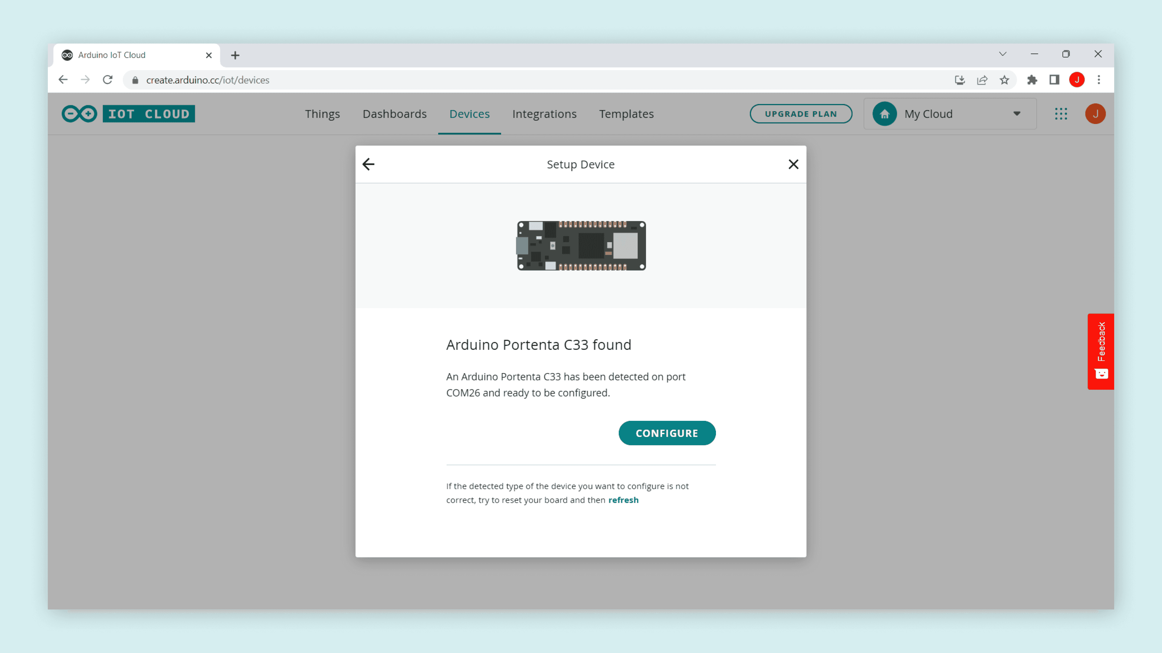 After a while, your Portenta C33 board should be discovered by the Arduino Cloud, as shown below: