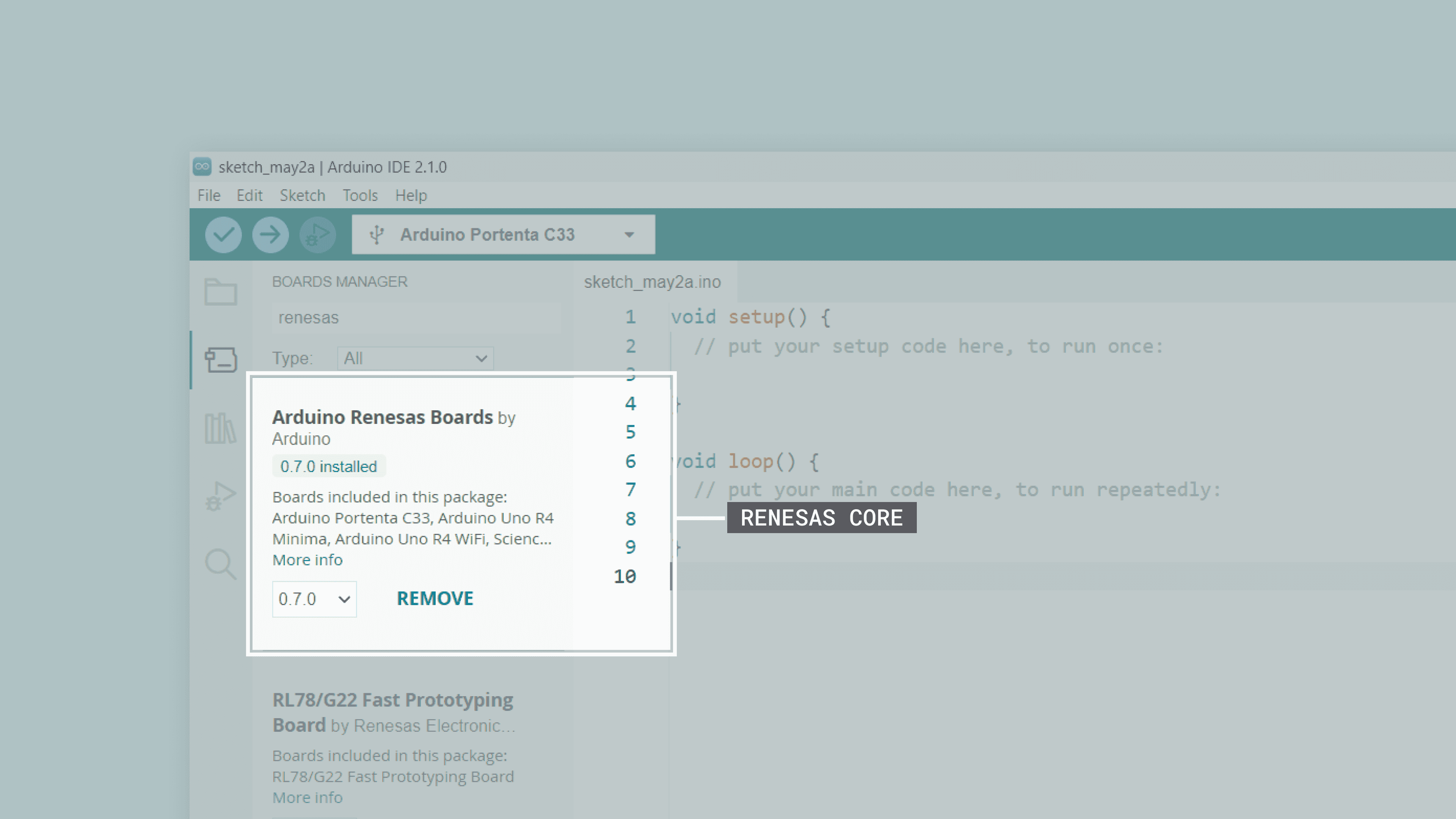 The Arduino Renesas Boards core contains the libraries and examples to work with the Portenta C33's peripherals and onboard components, such as its external QSPI Flash memory and Wi-Fi® and Bluetooth® module. To install the core for the Portenta C33 board, navigate to Tools > Board > Boards Manager or click the Boards Manager icon in the left tab of the IDE. In the Boards Manager tab, search for