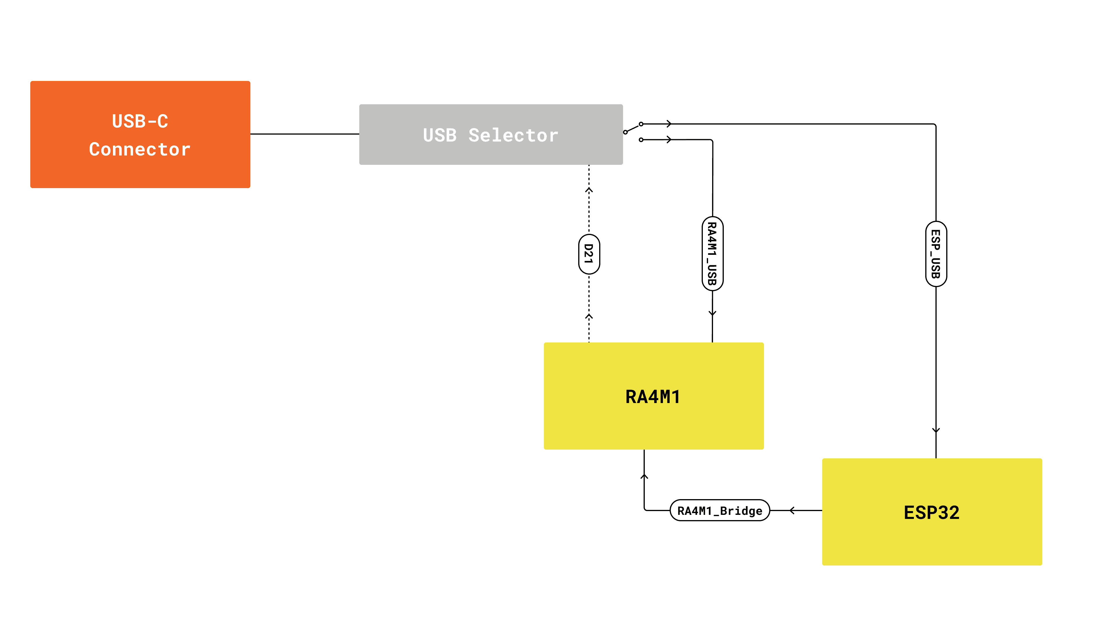 The ESP32 module and the Renesas RA4M1-chip are part of a sophisticated USB-Serial system that is highly flexible and adaptive to allow for HID features while still keeping the ability to program both the main MCU, and the ESP32, if you so wish. By default, the ESP32's is used mainly as a radio module using Wi-Fi® and Bluetooth®.